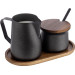 Tablett aus Akazienholz, LxBxH in cm: 19x10x1,5 cm. Milchkanne aus Edelstahl, schwarz PTFE beschichtet, ØxH in cm: 7,8x10 cm, Inhalt: 375 ml. Zuckerdose aus Edelstahl, schwarz PTFE beschichtet, mit Deckel aus Akazienholz, ØxH in cm: 7,8x6,7 cm, Inhalt: 220 ml. Löffel aus Edelstahl, schwarz PTFE beschichtet, L: 13,4 cm. Nicht spülmaschinengeeignet.
